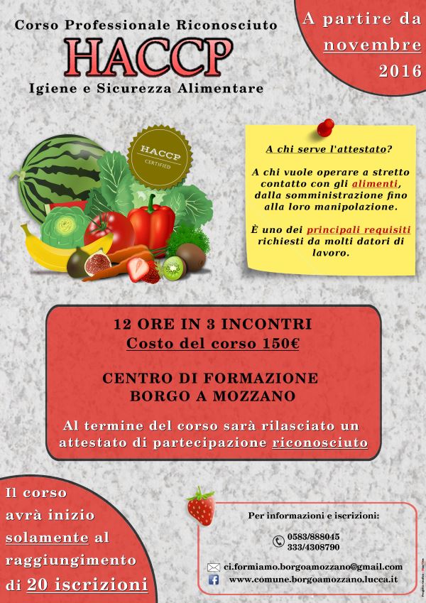 Per soddisfare le richieste di chi non è riuscito a partecipare al corso precedente, da novembre 2016 sarà organizzato a Borgo a Mozzano (Lucca) un nuovo corso professionale riconosciuto per ottenere l’attestato HACCP.