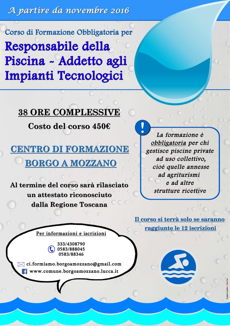 Da novembre 2016 sarà organizzato a Borgo a Mozzano (Lucca) il corso di formazione per “Responsabile della Piscina” – “Addetto agli Impianti Tecnologici”, obbligatorio per tutti i maggiorenni che si occupano della gestione o della cura di una piscina privata a uso collettivo.