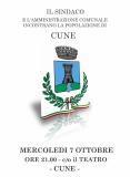 Il Sindaco incontra i Cittadini di Cune Mercoledì 7 otobre prossimo, ore 21, presso il Teatro