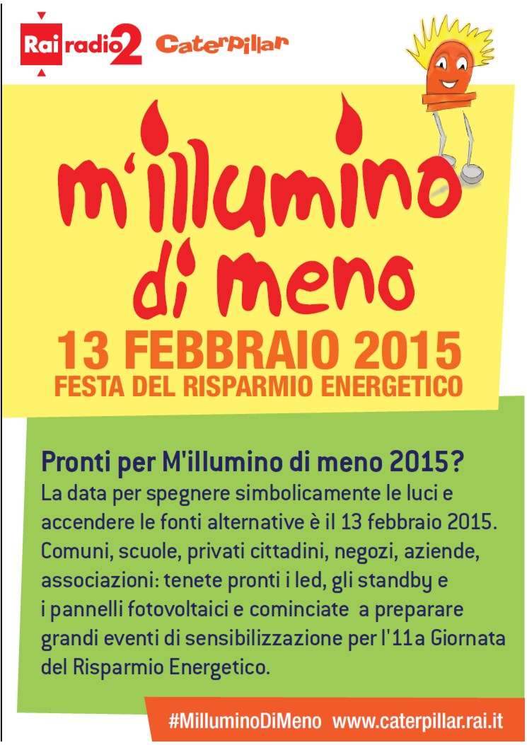 “M’illumino di Meno” è una grande campagna di sensibilizzazione sulla razionalizzazione dei consumi energetici e si avvale da anni dell’Alto Patrocinio del Parlamento Europeo e della Presidenza della Repubblica, nonché delle adesioni di Senato e Camera dei Deputati.